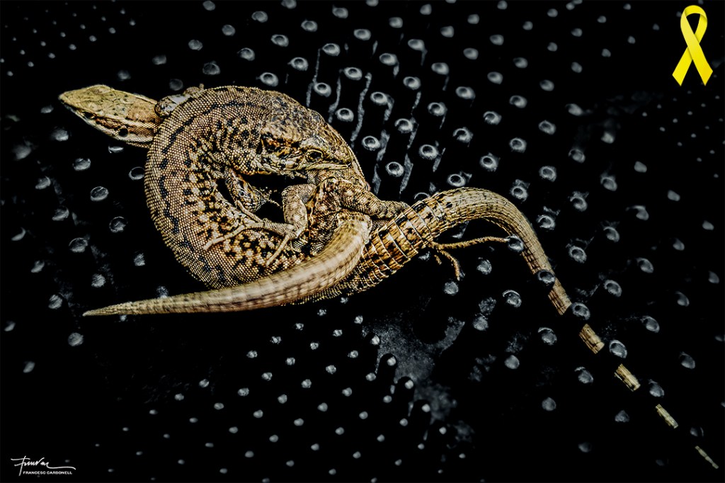 No crec. Segurament es tracta d’un ritual d’aparellament. En tot cas, seria el que els francesos anomenen la “petite mort”. El mascle, encegat per l’excitació, se la menjaria. Literalment. Ella, en canvi, sembla que no està gaire per la feina, malgrat l’evident violència masclista. Però no, tot i que és temptador, no humanitzarem l’escena. Per bé que és innegable que compartim una part gens menyspreable de la nostra dotació genètica respectiva amb aquests animalons que s’arrosseguen. Fins i tot hom parla del nostre “cervell reptilià”, que es veu que controla les nostres funcions vitals més importants, entre elles, precisament, l’impuls reproductiu… Ehem, no emboliquem més la troca. Deixem-ho aquí…