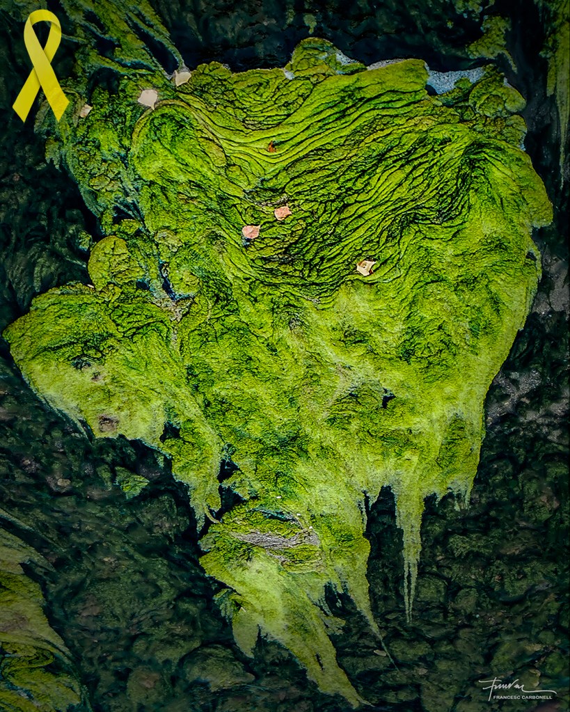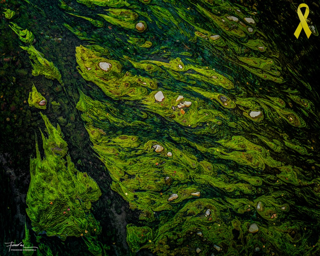 Diuen que la proliferació d’algues a les aigües dolces és deguda a una abundància de nutrients, que poden provenir dels fertilitzants amb que els agricultors adoben els camps, i que en época de moltes pluges són arrossegats als cursos fluvials. El cas és que aquestes acumulacions poden arribar a fer composicions de formes i colors sorprenents que he cregut que mereixien ésser fotografiades…
