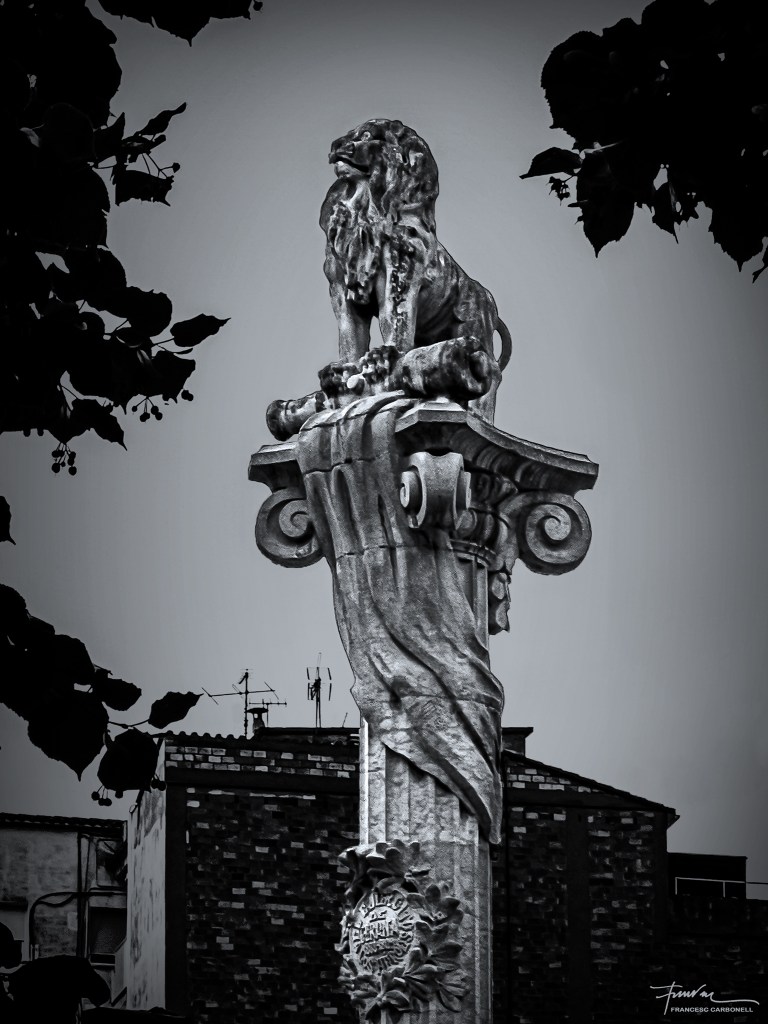 El nom de la plaça i del mercat prové del lleó que hi ha dalt de la imponent columna del monument, erigit el 1909, inaugurat en els actes de commemoració del centenari de la “Guerra del francès”, en homenatge als heroics defensors de Girona durant els cruels setges que patí la ciutat en els anys 1808-1809.