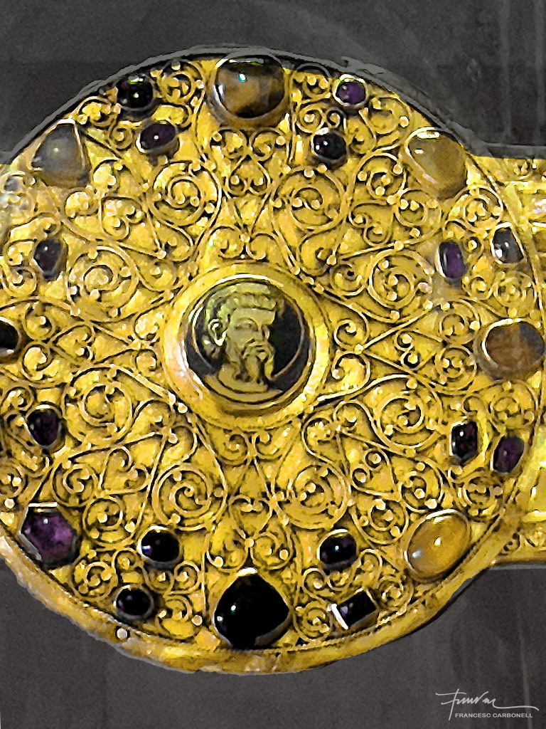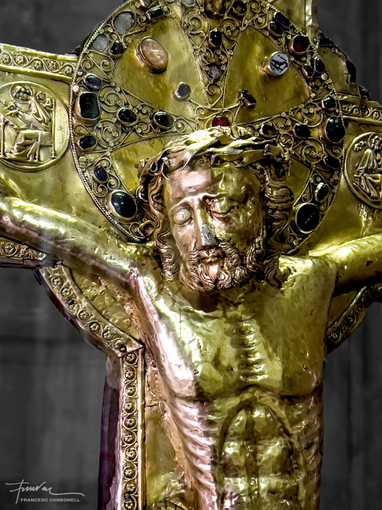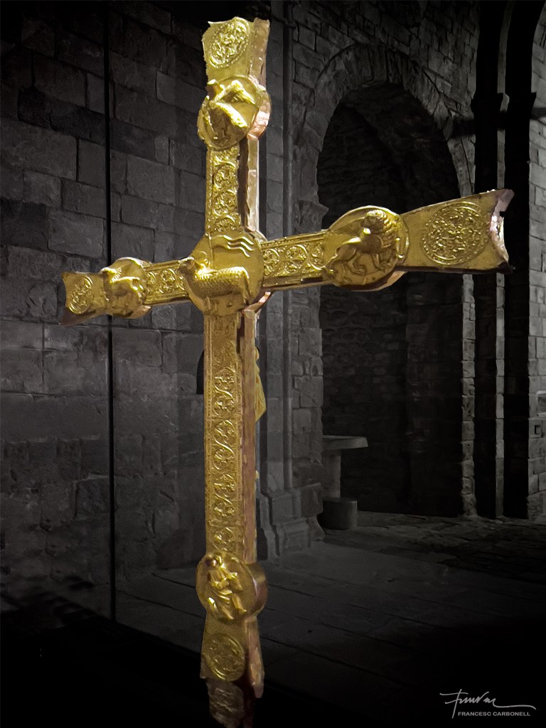 La creu de Santa Maria de Vilabertran -el monestir romànic del segle XI/XII, ubicat al poble de Vilabertran (Alt Empordà, Catalunya), del qual n’hem publicat imatges als dos posts anteriors- és la creu processional d’orfebreria gòtica més gran de Catalunya. Està datada al primer quart del segle XIV. Està feta de fusta de roure recoberta de làmines d’argent sobredaurat i pedres precioses.