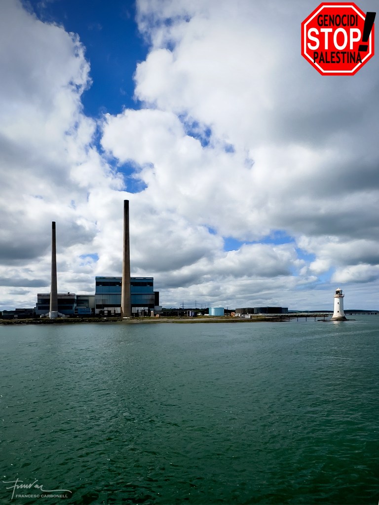 Entrada al ferri. Al fons les enormes xemeneies de la central elèctrica.