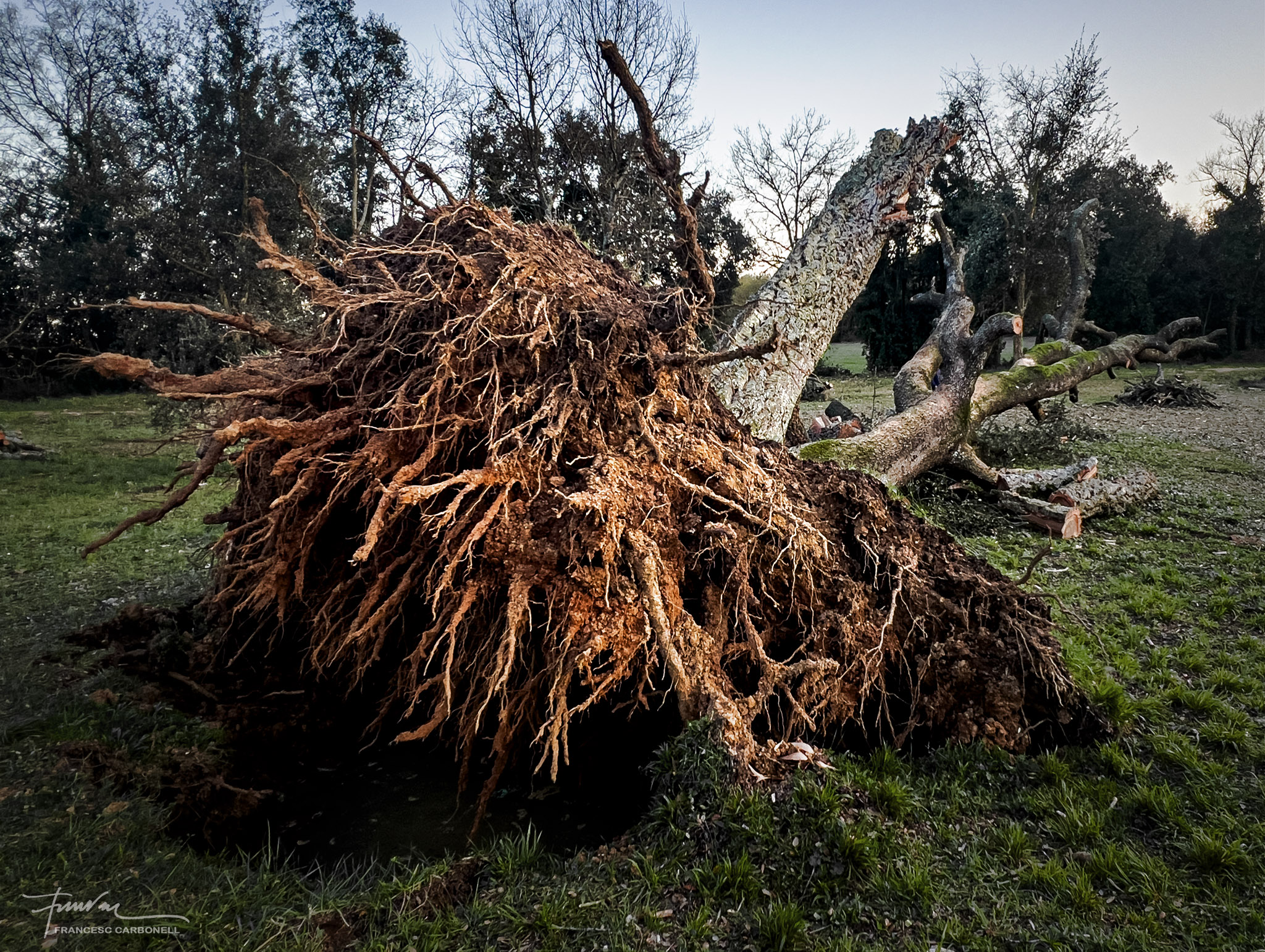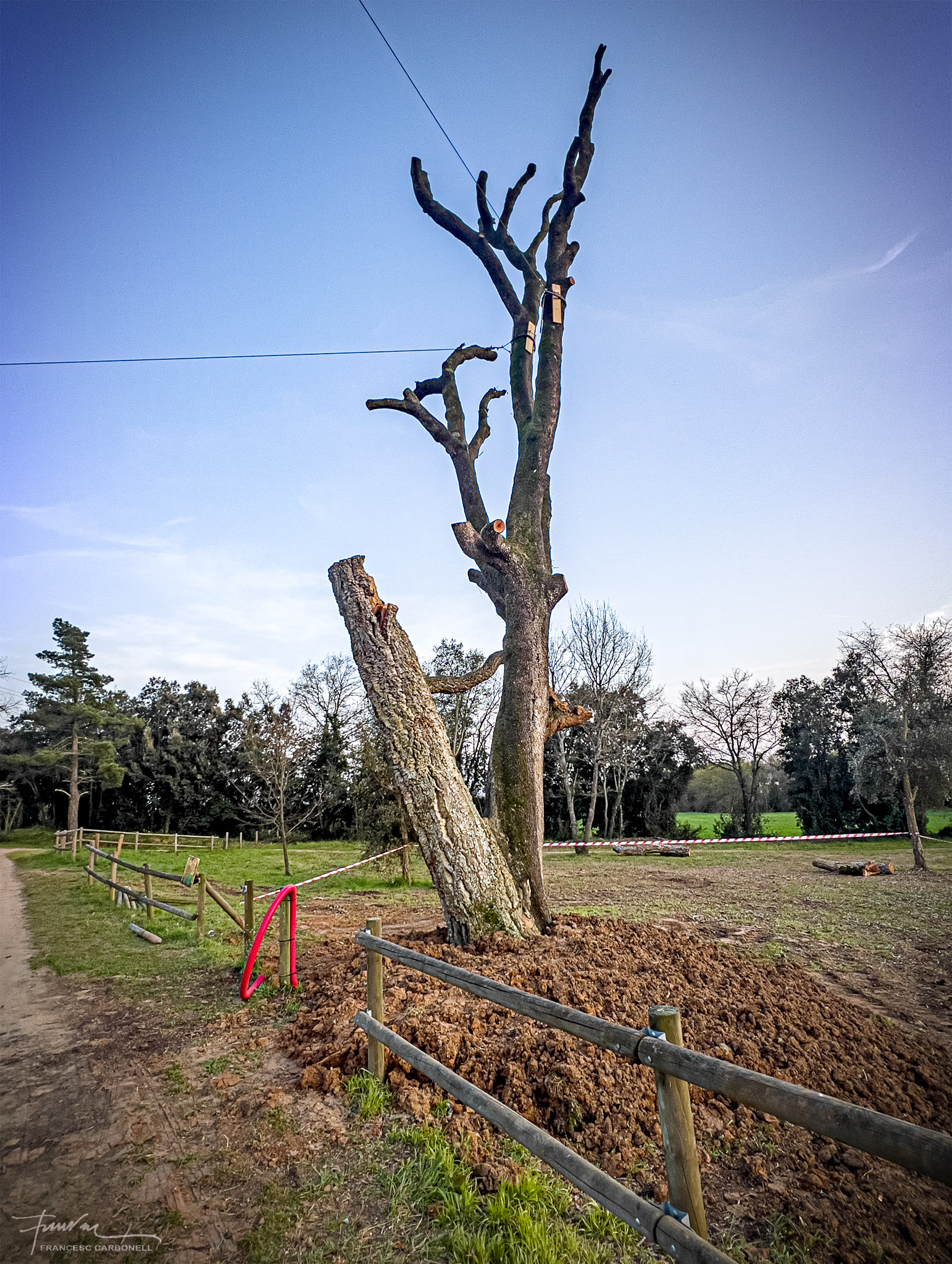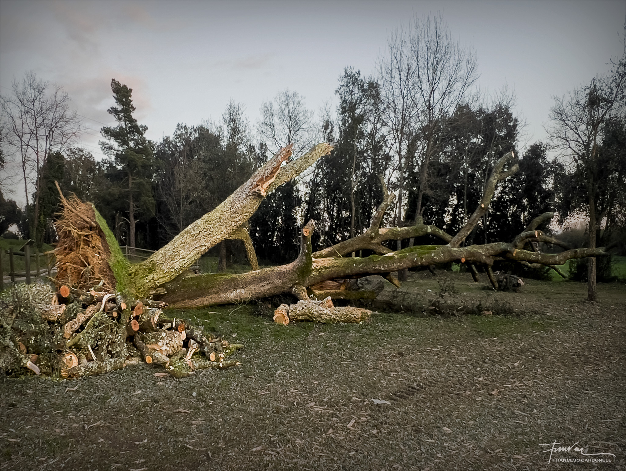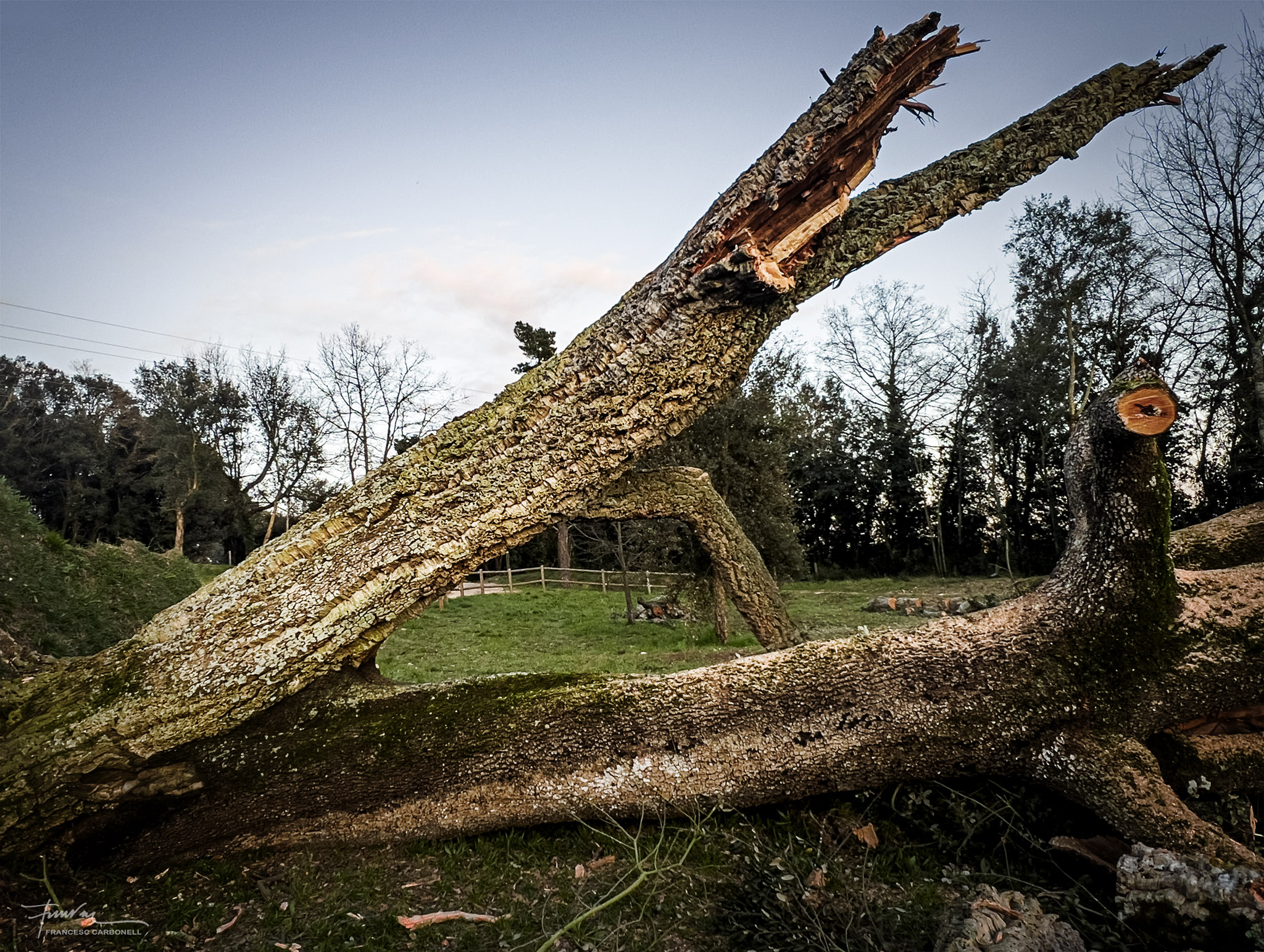 Aquest arbre únic a Catalunya, que a la vall anomenen el Surolí i al qual ja vaig dedicar-li un altre post ara fa cinc anys, és una autèntica raresa botànica, segons els experts. Es tracta de dues espècies d’arbre de la mateixa família, una alzina i un suro, que han nascut i creixen soldats, formant un únic peu, amb els teixits units.Doncs la ventada també va abatre aquest vell i curiós espècimen.Quan vaig arribar, els forestals ja havien tallat tot el brancatge.Noteu la textura diferent de les escorces de les branques de suro de les de l’alzina.Aquí es poden percebre clarament les dues soques “siameses” diferenciades per la textura de l’escorça, a dalt el suro, molt més malmès, i a sota l’alzinaEls forestals, però, no s’han resignat a perdre un arbre tan emblemàtic i amb l’ajuda de potents grues l’han tornat a “plantar”.Tots esperem il·lusionats a que arreli novament i torni a brotar…El regarem tant com convingui…Afortunadament, un altre arbre emblemàtic de la Vall, l’alzina malalta de Can Serra, ha resistit bé la ventada.