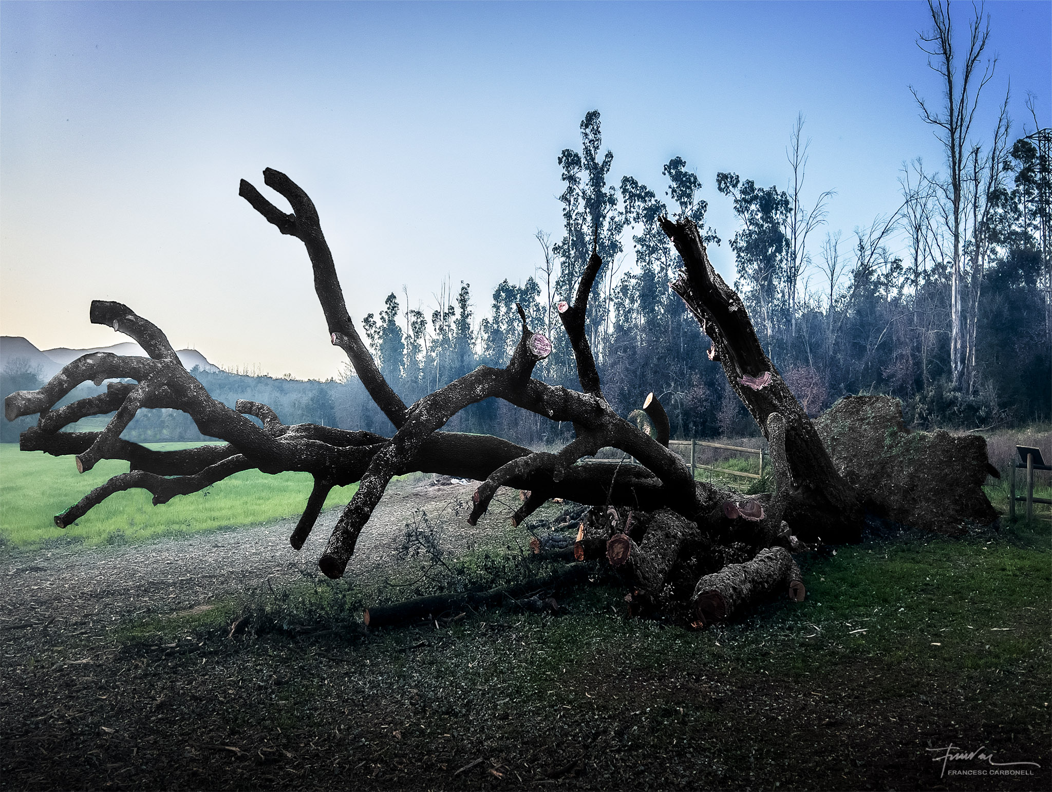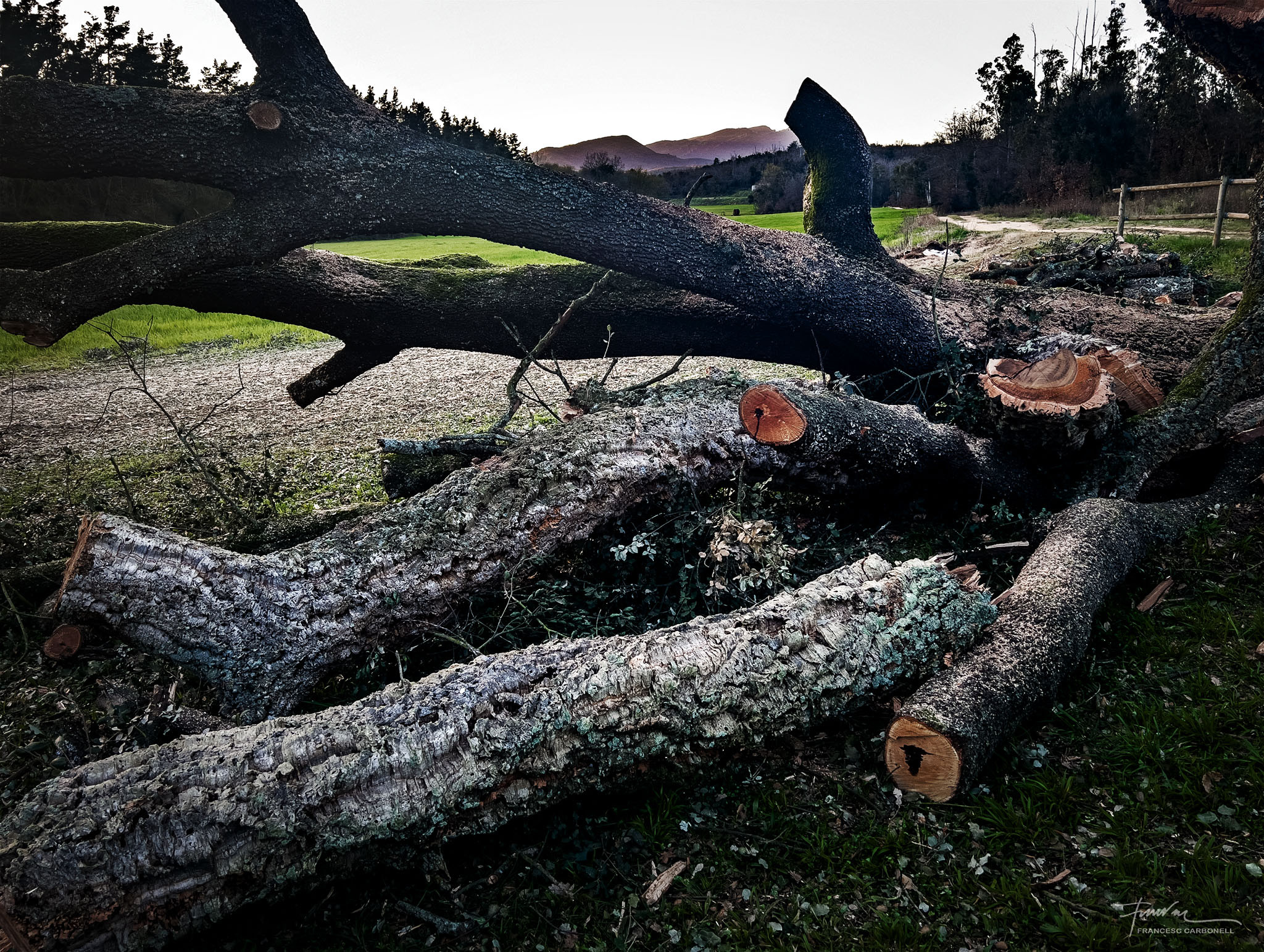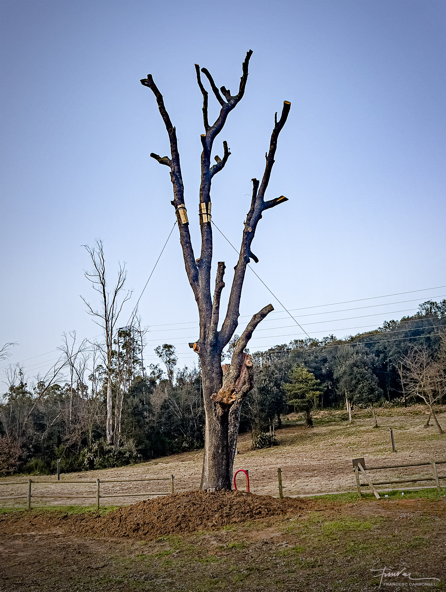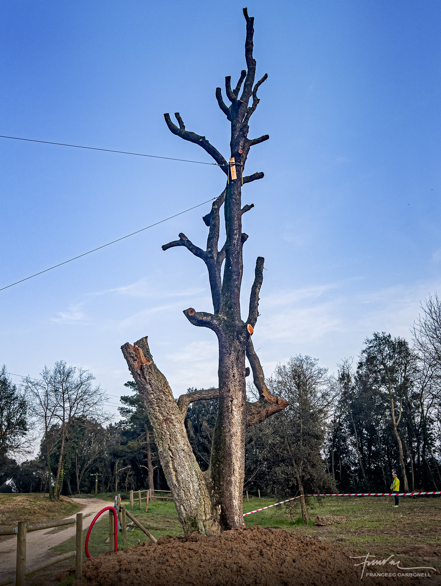 Aquest arbre únic a Catalunya, que a la vall anomenen el Surolí i al qual ja vaig dedicar-li un altre post ara fa cinc anys, és una autèntica raresa botànica, segons els experts. Es tracta de dues espècies d’arbre de la mateixa família, una alzina i un suro, que han nascut i creixen soldats, formant un únic peu, amb els teixits units.Doncs la ventada també va abatre aquest vell i curiós espècimen.Quan vaig arribar, els forestals ja havien tallat tot el brancatge.Noteu la textura diferent de les escorces de les branques de suro de les de l’alzina.Aquí es poden percebre clarament les dues soques “siameses” diferenciades per la textura de l’escorça, a dalt el suro, molt més malmès, i a sota l’alzinaEls forestals, però, no s’han resignat a perdre un arbre tan emblemàtic i amb l’ajuda de potents grues l’han tornat a “plantar”.Tots esperem il·lusionats a que arreli novament i torni a brotar…El regarem tant com convingui…Afortunadament, un altre arbre emblemàtic de la Vall, l’alzina malalta de Can Serra, ha resistit bé la ventada.