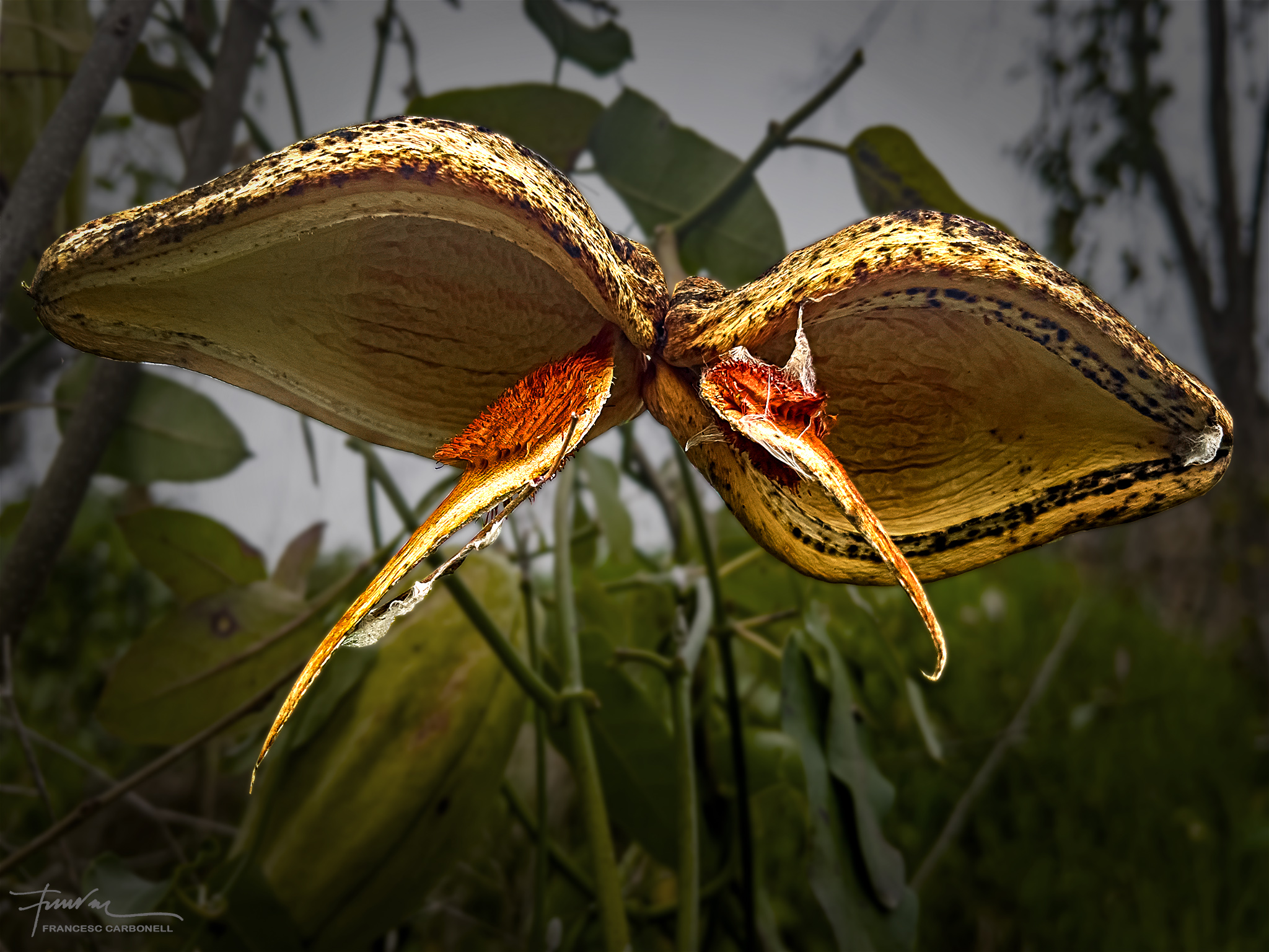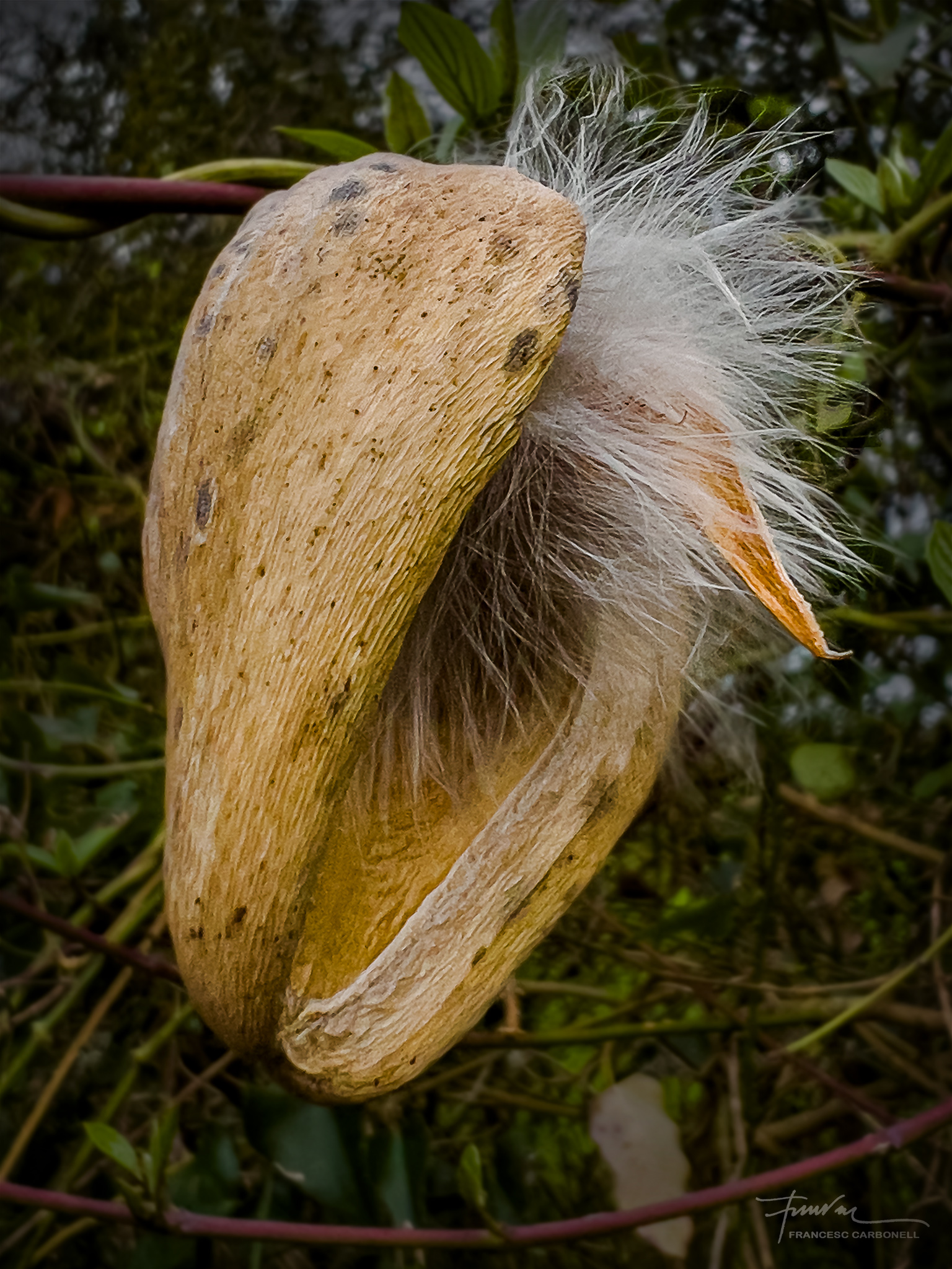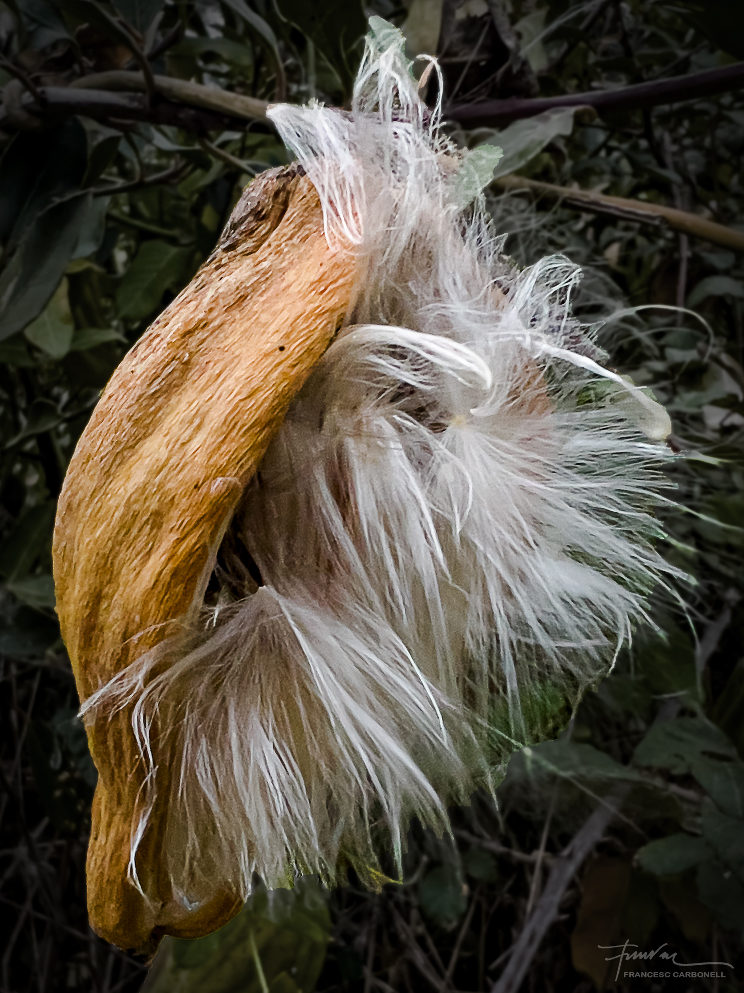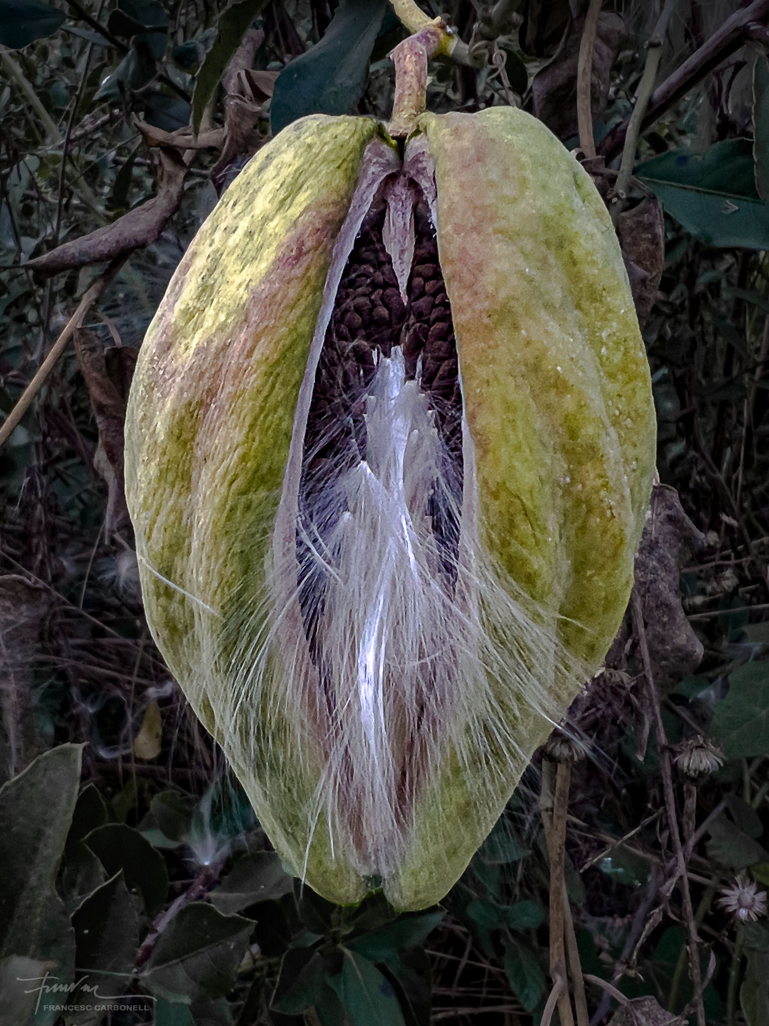 També anomenat miraguà de jardí, el miraguà fals (Araujia sericifera) és una planta exòtica invasora. Sericifera significa «que porta seda» i es refereix als seus pèls sedosos que envolten les llavors. La planta és una liana que fa fins a 5-7 m de llarg, és capaç d’ofegar els arbres més alts fins que els mata. També causa molts problemes a l’agricultura, pel seu ràpid creixement. S’emparra fàcilment sobre qualsevol suport, especialment tanques i arbres. El que presentem aquí són els seus fruits que són grans tavelles de 8-10 cm de llargada i que contenen, com es pot veure, moltes llavors negres amb filaments sedosos per facilitar, gràcies al vent, la seva expansió.