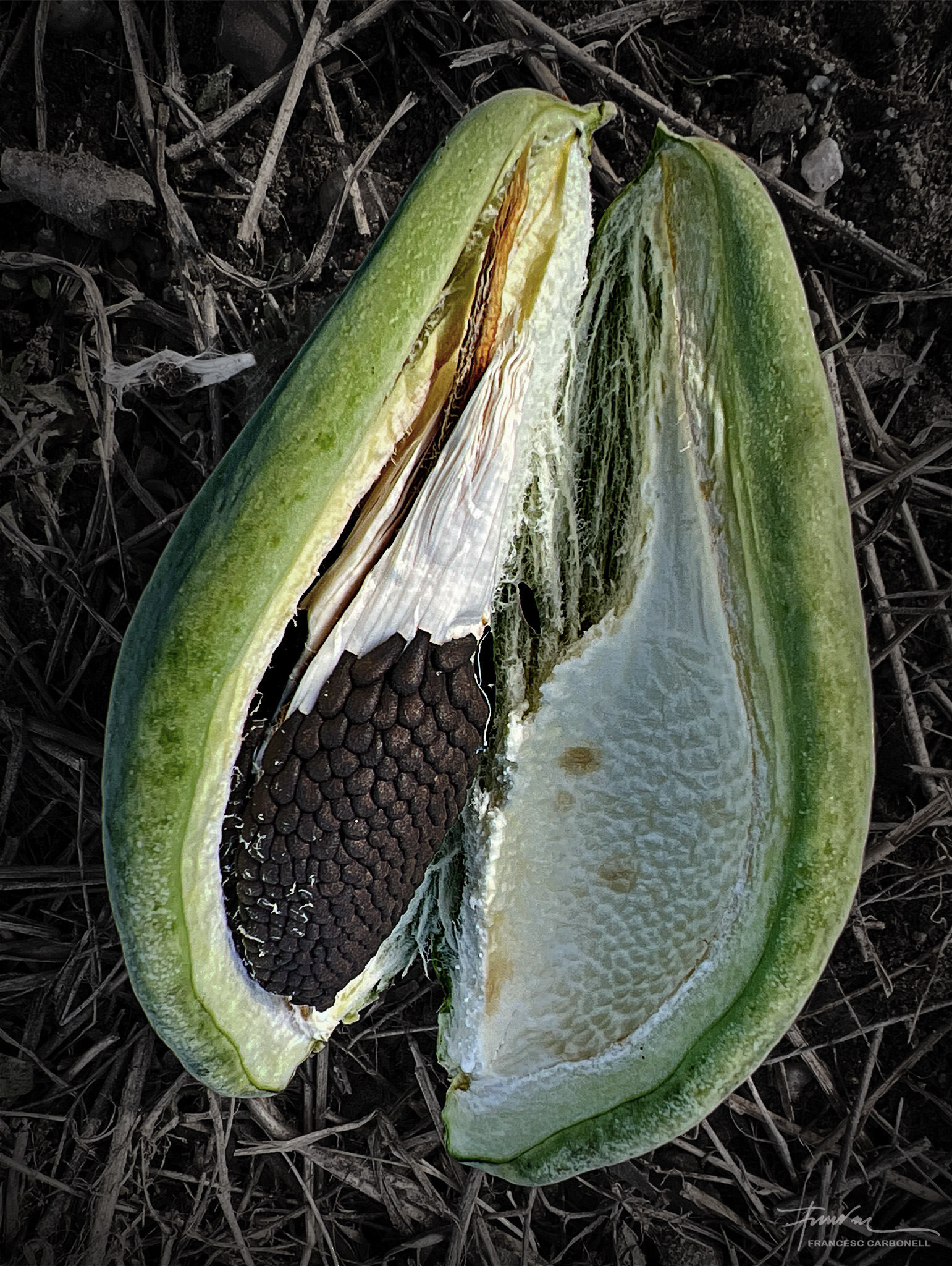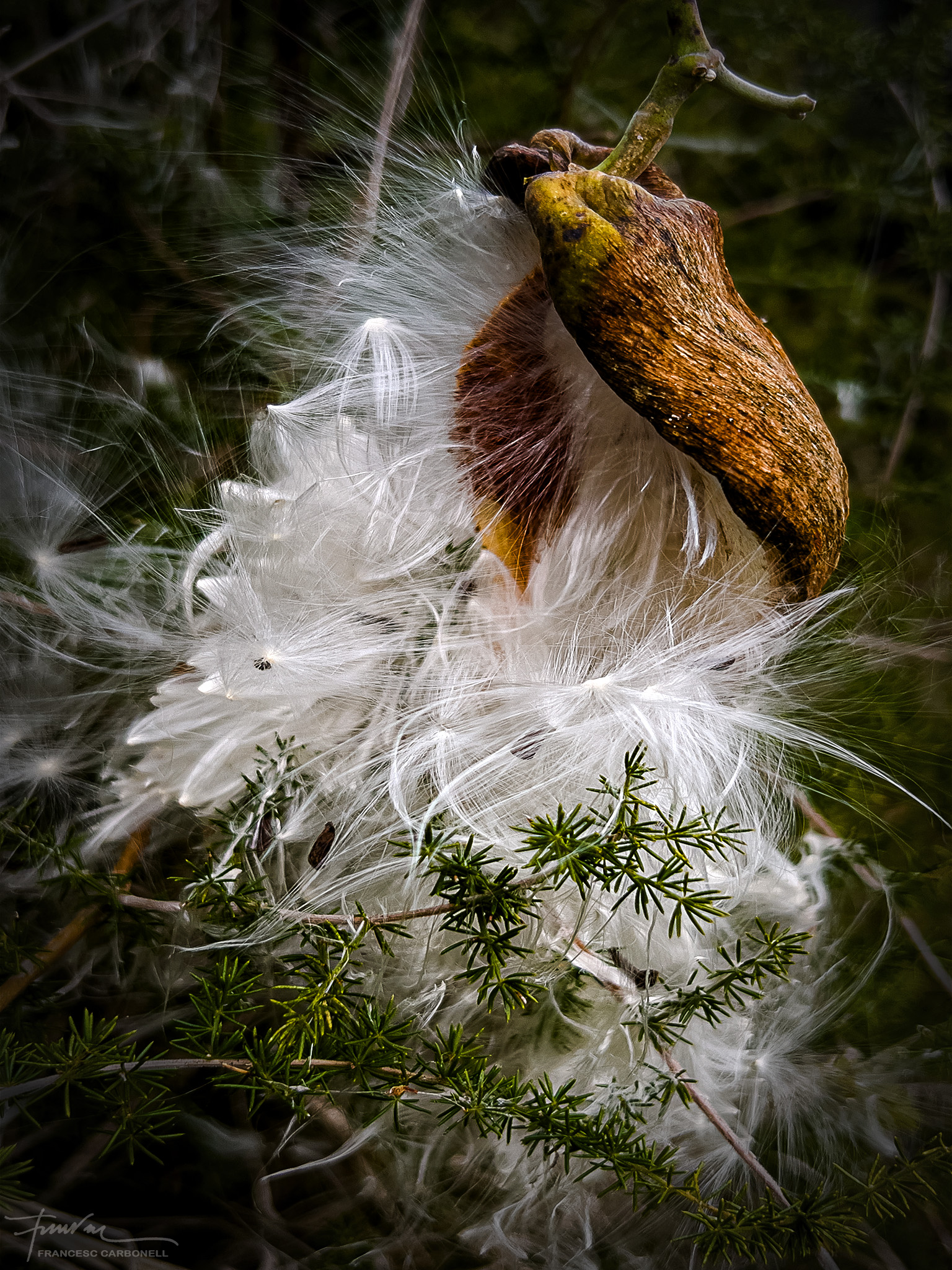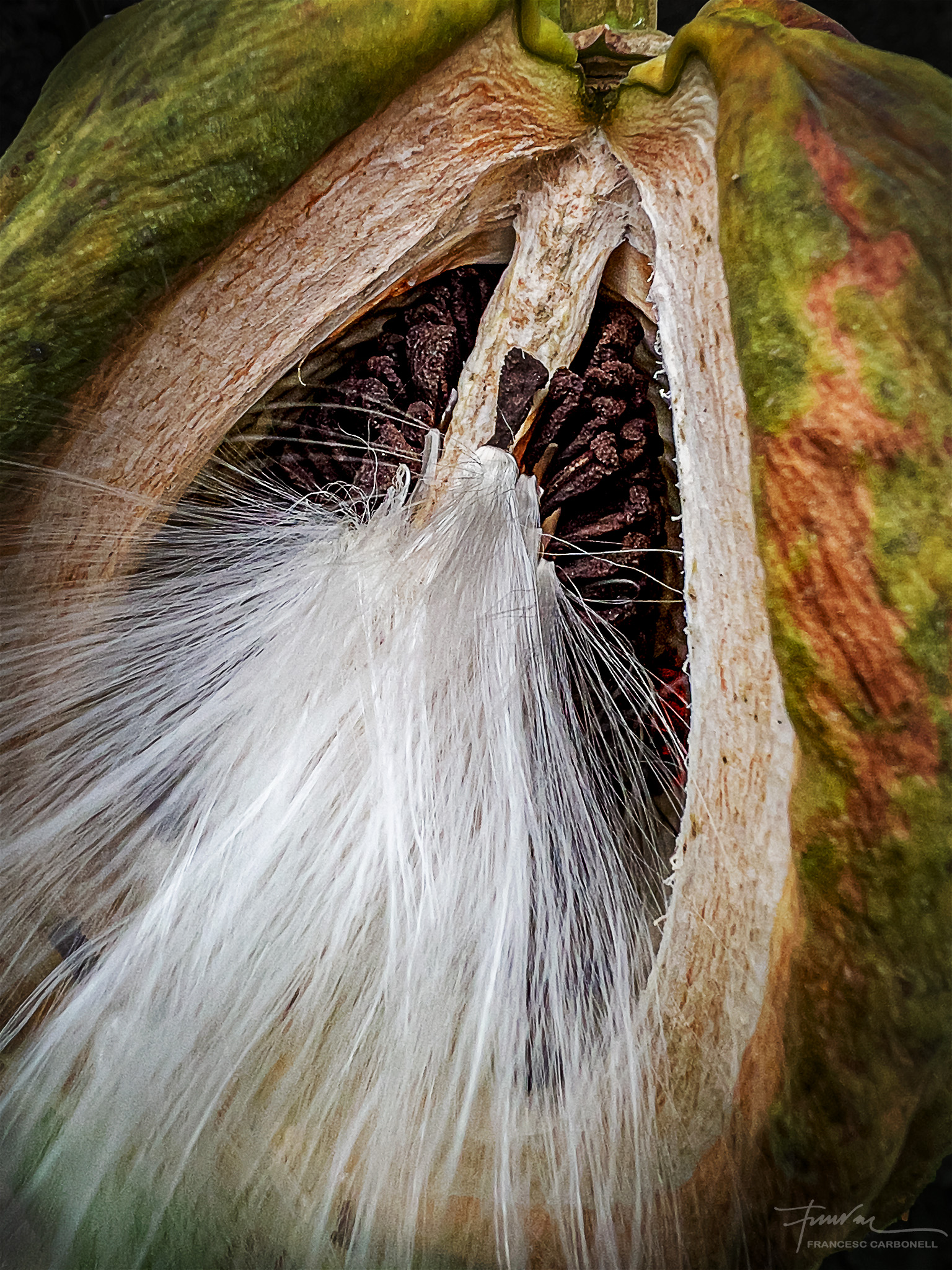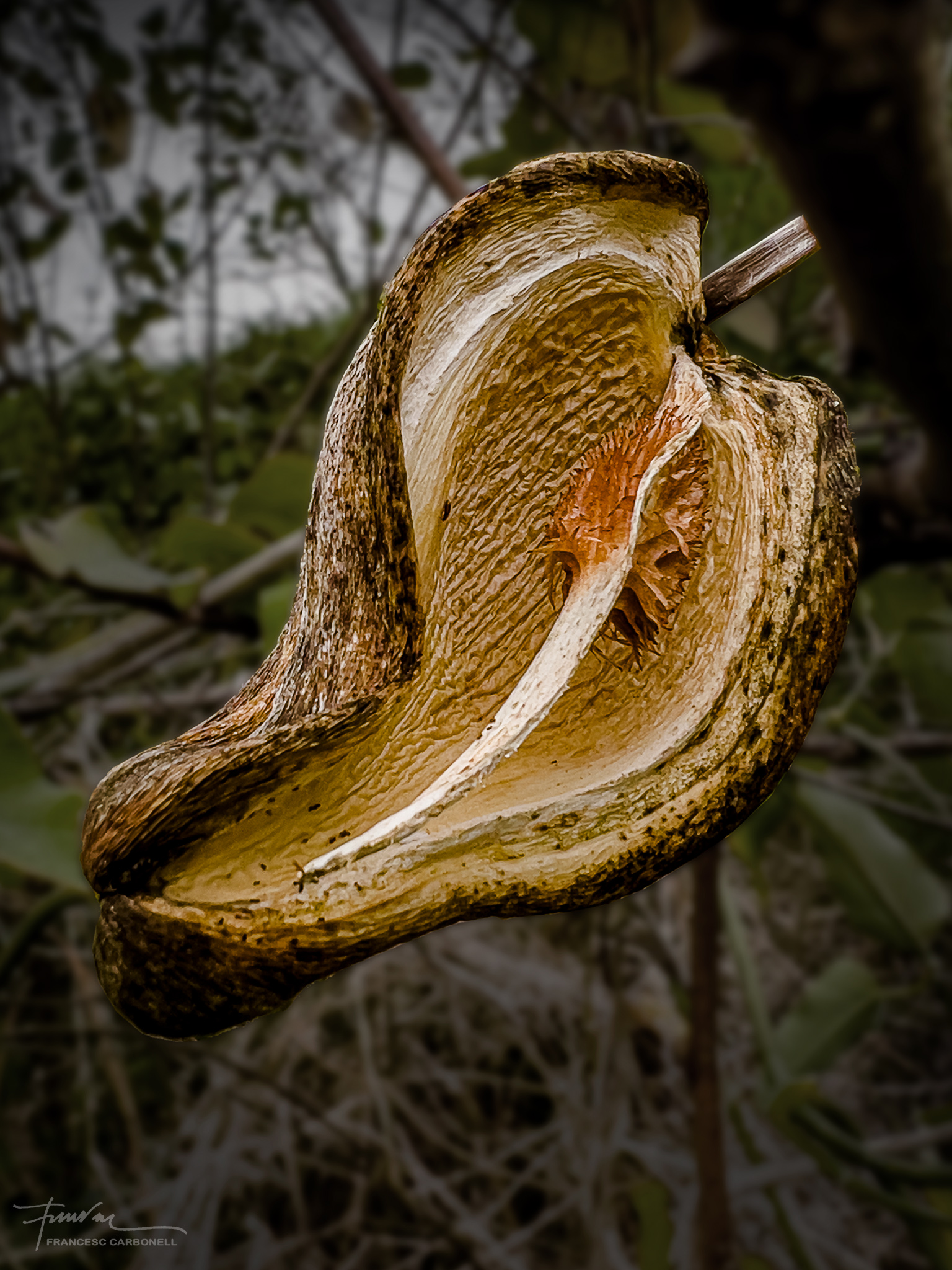 També anomenat miraguà de jardí, el miraguà fals (Araujia sericifera) és una planta exòtica invasora. Sericifera significa «que porta seda» i es refereix als seus pèls sedosos que envolten les llavors. La planta és una liana que fa fins a 5-7 m de llarg, és capaç d’ofegar els arbres més alts fins que els mata. També causa molts problemes a l’agricultura, pel seu ràpid creixement. S’emparra fàcilment sobre qualsevol suport, especialment tanques i arbres. El que presentem aquí són els seus fruits que són grans tavelles de 8-10 cm de llargada i que contenen, com es pot veure, moltes llavors negres amb filaments sedosos per facilitar, gràcies al vent, la seva expansió.