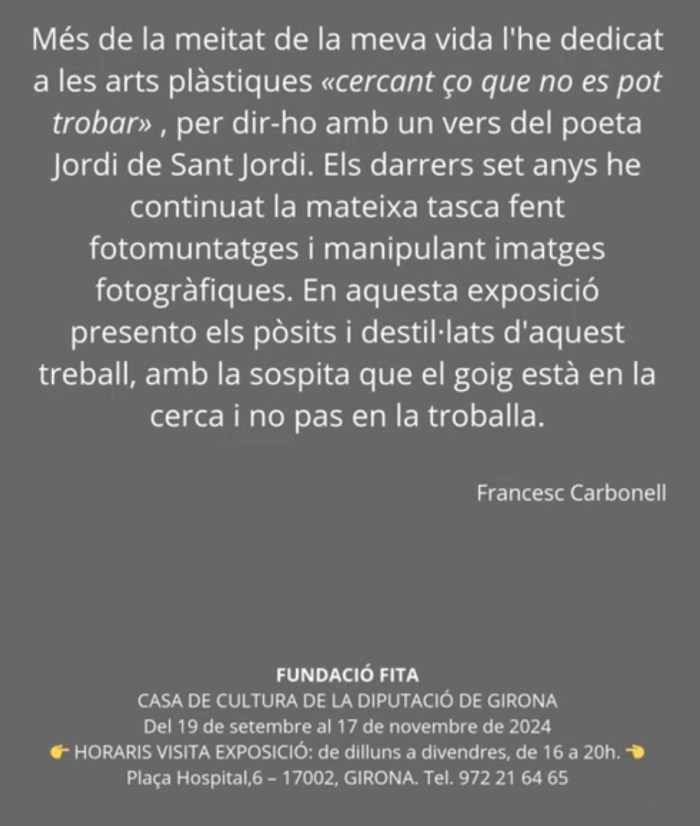 En aquest apartat de la web 6qsite.com hi mostrava fins avui una tria de les imatges que havia anat publicant al bloc els darrers mesos, a l’espera d’agrupar-les (després d’una segona tria) en algun llibre monogràfic que aniria a parar a la secció “Llibres digitals”. Però la tardor de 2024 vaig fer una exposició de fotografia a la Fundació Fita de Girona: