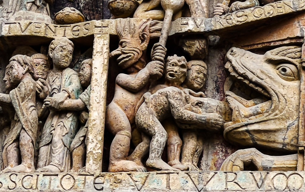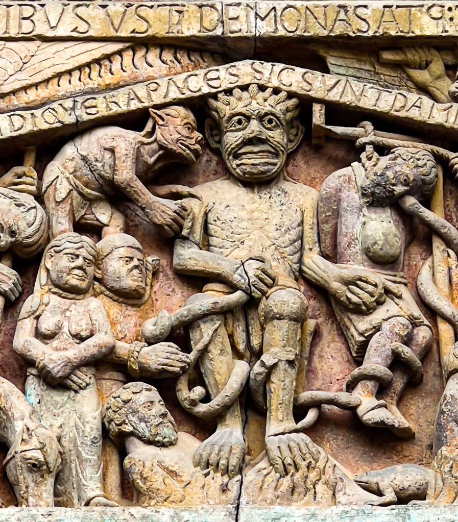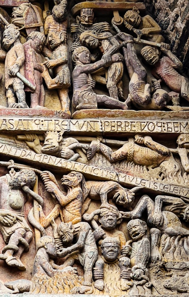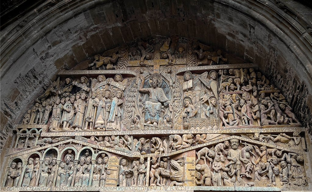 Vista de l’absis de l’església abacial de Santa Fe de Conques (segle XI-XII). Fins a meitat del segle XVI hi va haver una comunitat benedictina que havia arribat a acollir més d’un centenar de monjos en els moments de més esplendor de l’abadia, a inicis del segle XII, que és quan es construeix l’església, el claustre i altres dependències.Façana principal de l’església romànica de Santa Fe on es pot apreciar el magnífic timpà del pòrtic.El timpà és una representació del judici final i conté un total de 124 personatges, molts d’ells -tant els sants com els pecadors- són identificables pels símbols o els objectes que traginen, o pel tipus de tortura que reben. Exactament a sota del Pantocràtor un àngel i un dimoni pesen en unes balances les ànimes i decideixen si van al cel (al sí d’Abraham), o van a l’infern. A la dreta del Pantocràtor, els justos; a l’esquerra, els pecadors. És evident la intenció “pedagògica” i adoctrinadora d’aquest aterroritzant “còmic de pedra” medieval.El Pantocràtor.La desfilada dels justos, precedida per la Verge Maria i Sant Pere.L’àngel i el dimoni es miren en la bifurcació de l’entrada al cel o a l’infern, cadacú tenint cura dels seus.Llucifer presidint l’infern, mira fixament l’espectador assenyalant-li amb l’índex i una rialla el lloc de l’infern que l’espera si no segueix el recte camí. Es veuen els adúlters lligats pel coll, l’avar que no deixa la bossa de monedes ni quan l’estan penjant, etc.Altres vistes terrorífiques dels càstics dels condemnats; al mentider i/o calumniador, per exemple, li arrenquen la llengua mentre es crema al foc etern.