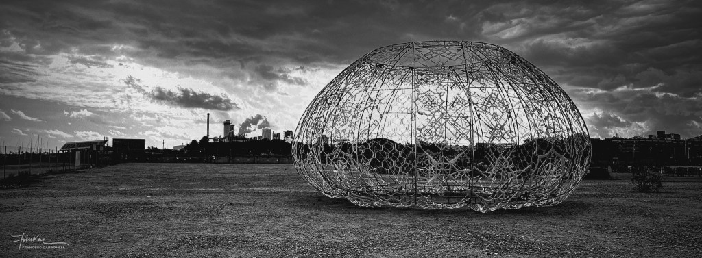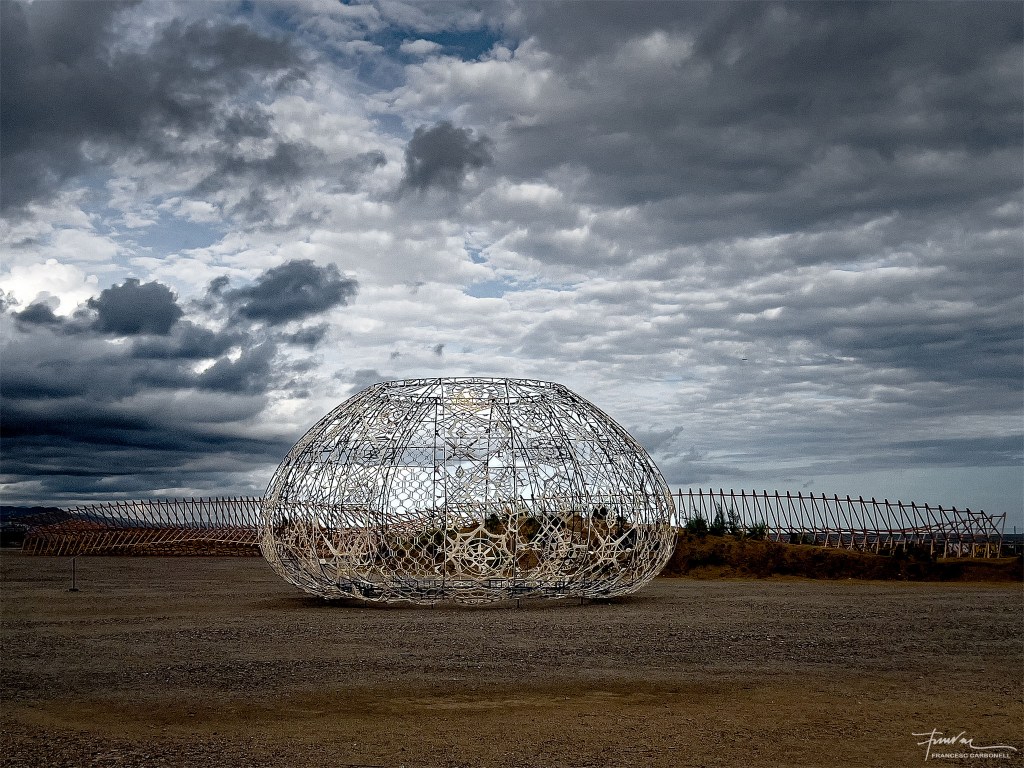 L’entrada a l’impressionant recinte de les Tres Xemeneies.Avui us mostrarem una de les instal·lacions que hi havia a l’exterior de l’imponent edifici de Les Tres Xemeneies.Es tracta d’aquestes dues peces titulades URCHINS, que han sigut dissenyades pels arquitectesJin Choi y Thomas Shine.Estan realitzades amb corda de pescar, teixida a mà amb la tècnica popular anomenada “ganxet”, per 120 voluntaris, tensada sobre una estructura d’acer.Les dues peces URCHINS evoquen les closques dels eriçons de mar, als quals fa referència el nom del projecteEn aquesta imatge es pot veure en segon terme una altra instal·lació d’aquesta exposició realitzada per l’artista holandès Niels Albers anomenadaWINGS (X-205) 2024, a la qual dedicarem el proper post.
